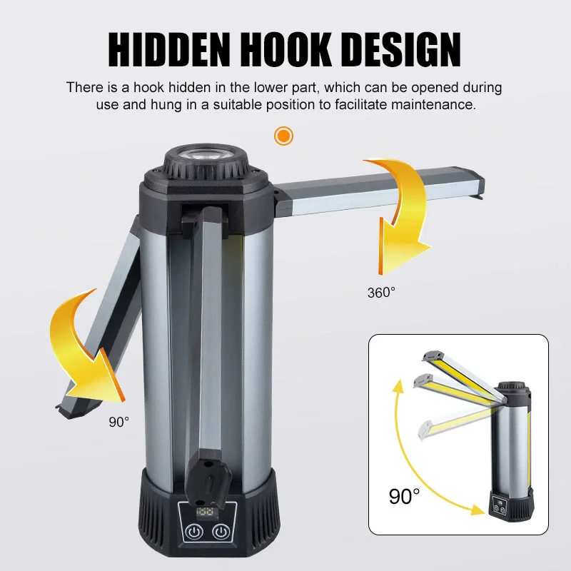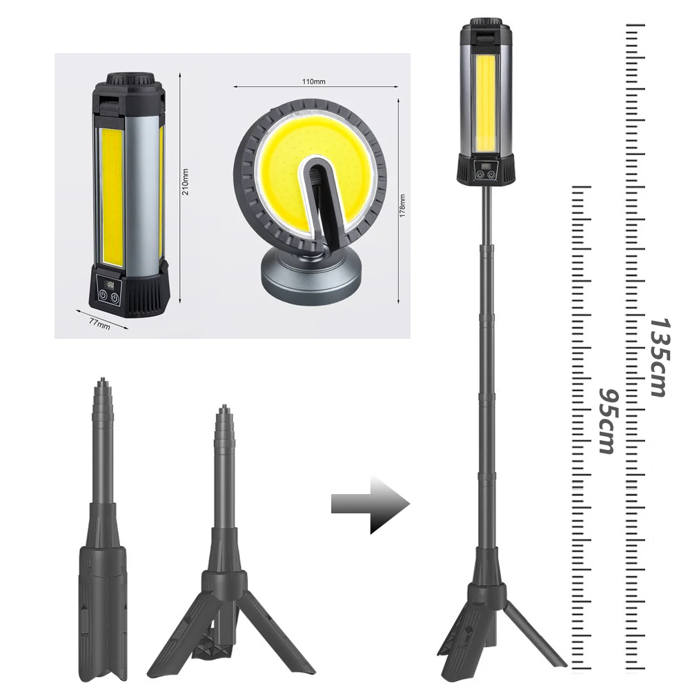 Features: Dual White & Yellow Light Sources, Combines P50 Long-range and COB Short-range Lights, Digital Display, Supports Output, Comes with Hook and Magnet, Mountable on Tripod, Adjustable Stand, Large Area COB Floodlight Source, Can Rotate 270 Degrees, Suitable for Work, Outdoor Camping, etc., LED Power Indicator Shows Percentage